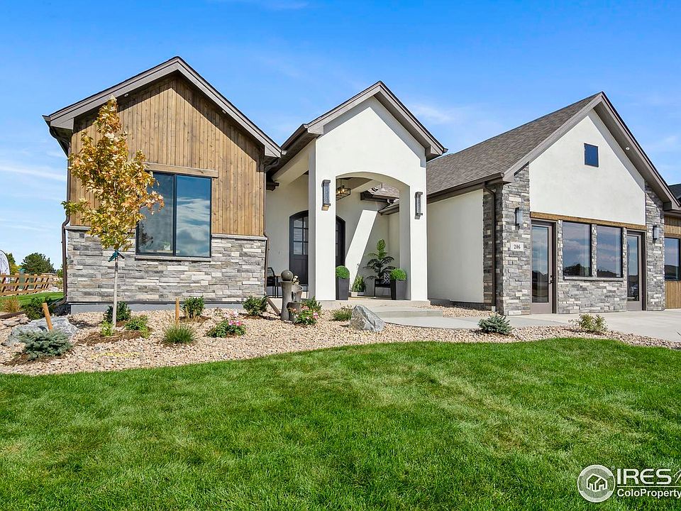 This former ranch style model home sits on a premium south facing corner lot in the highly desired Greenspire at Windsor Lake community. Designed to make a lasting first impression, it features elevated finishes and thoughtful details throughout. With a greenbelt as the backdrop and no rear neighbors, the outdoor setting feels open, quiet, and perfectly connected to nature. From the moment you step through the arched front doors, the interior feels bright and inviting with vaulted ceilings and expansive windows that frame the Colorado sunshine. The open layout flows naturally between the kitchen, dining, and great room. An oversized linear fireplace with an extended hearth creates a warm focal point for relaxed evenings or memorable gatherings. The gourmet kitchen makes a statement with its dual island, quartz countertops, gas range, custom cabinetry, beverage fridge, and secondary prep sink. It is a space that works beautifully for hosting friends, preparing family meals, or enjoying slow mornings with coffee. The primary suite is tucked away for privacy and lives like a retreat, complete with a freestanding soaking tub, walk in shower, and dual vanities. A shiplap ceiling, exposed beam, and a private fireplace add character to the space. Downstairs, the finished basement offers room to spread out with a large recreation area, two additional bedrooms, a full bath, and a wet bar. A dedicated theater room makes movie nights and game days feel special. A spacious three car garage provides room for storage, hobbies, and all the gear that comes with Colorado living. Full yard landscaping is included so the home is ready to enjoy on day one. Schedule your private tour today and experience the best of life at Greenspire at Windsor Lake.