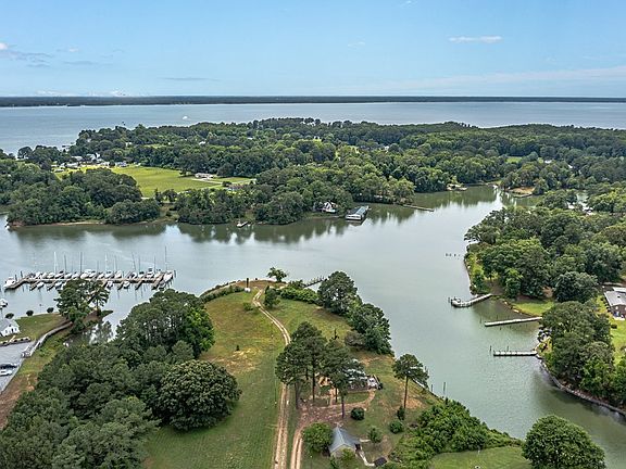 Located on Carter Cove, just off Rappahannock River and minutes to Chesapeake Bay. Convenient to towns of Kilmarnock, White Stone, Irvington for shopping, dining, entertainment, medical services. Deep water at pier, buyer to measure to satisfaction. Hang pots off pier to catch and enjoy crabs. Kitchen with eat at counter is open to living and dining great room with vaulted ceilings, fireplace, water view. Front room off great room, currently office, use to suit. Ensuite owner bedroom, two guest bedrooms, and hall full bath. Total rooms and square footage stated includes main floor 1695+-sf and a 325+-sf room in basement with fireplace. Basement has interior and exterior access, unfinished space offers workshop room, storage, open area, mechanical and utility room. Detached 2 car garage with lean-to addition for yard equipment, tools. House roof shingles installed 2016, garage shingles 2010. See Owner prepared list in Documents for appliance purchase dates, improvements. Rear deck. Gentle slope to pier. Enjoy kayaking on the creek. Floating dock on trailer located on land can convey if desired, trailer will not convey. High speed internet available. Central air/heat pump and forced air oil. System designed to use forced air oil for warm heat when outside temperatures drop below 40 degrees. Septic system has pump tank to remote drainfield located on adjacent parcel easement; washer in basement gravity drains to drain line in rear. Proposed public boat ramp on adjacent parcel. Sold as is, where is. Buyer's inspections/study period for information to determine satisfaction.