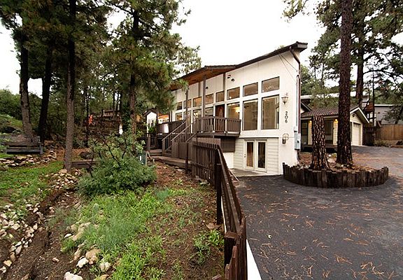 Enjoy a snow storm while toasty warm from all the windows.. House was expanded in 2000 with lots of double pained windows. Stone coated Steel Roof. Large living area with a stand alone gas log fire/p, dining area also has a gas log fire/p. Lots of tile floors, 2 B/R, 2 baths, kitchen, breakfast nook on entry level. Either 3rd B/R or large game room downstairs with outside entry and workshop area. Attached 1 car garage with work shop area. Central air, 2 heaters and 2 water heaters. Master (wood) has 2 walk in closets, walk in shower, and large Jacuzzi. Beautifully terraced yard with wood fence. Rock Waterfall. A river runs thru it with a rocked natural drain Carpet in 1 B/R -game RM