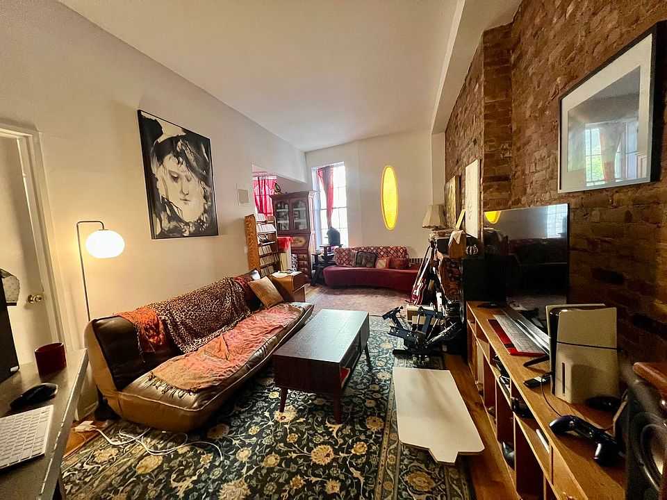 Beautiful one-bedroom residence featuring exposed brick, high ceilings, a dining alcove, and hardwood floors throughout.