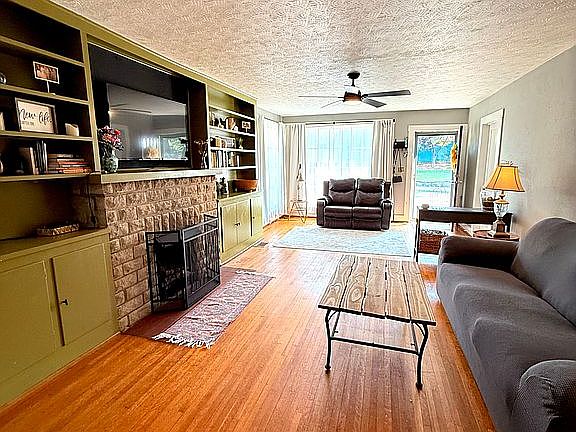 Formal dining areaBuilt in bookshelvesSpacious family roomSun filled kitchenStone fireplaceBeautiful wood floors