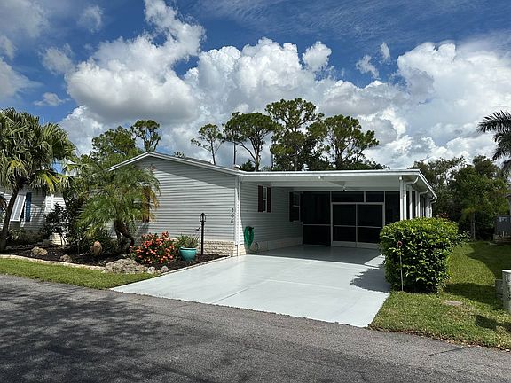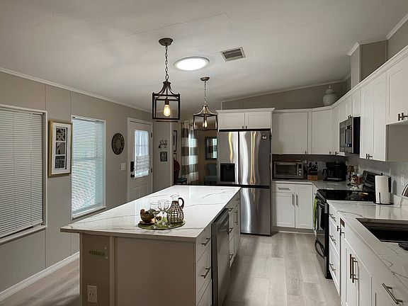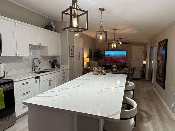 A stunning, completely redesigned spacious home with modern upgrades and quality materials in timeless neutral colors. Offering 2,100 sq ft in a charming boutique neighborhood, just minutes to Venice beaches and Wellen Park activities. This home features 3 bedrooms, 2 full baths, and a flexible great room with a chef's kitchen. The kitchen boasts an 8' quartz island with abundant storage drawers, pantry, quartz counters, new stainless appliances, and a dining area that flows into a bonus den, TV, or sitting space. A separate laundry room adds convenience. The dining room leads into a light-filled living room, creating an inviting gathering space. The primary suite accommodates a king bed and walk-through closet. The en suite bath offers a custom tiled shower, marble finishes, and dual vanities. A split floor plan provides privacy, with two guest bedrooms large enough for king beds. The third bedroom, currently a design studio, includes a walk-in closet. Both bathrooms feature new higher toilets and marble vanities. Enjoy your private backyard from the tiled all-seasons room overlooking the rear patio and preserve views. A large screened front porch, just off the double-wide carport, leads to a workshop with separate AC and an additional screened storage area. Consistent neutral flooring and paint throughout the home create a cohesive, timeless look. Every comfort has been considered: ceiling fans, coordinating light fixtures, under-cabinet lighting, and more. Major updates include interior renovation (2023), a new roof (2021), new AC (2024), new ductwork, vapor barrier, and tie-downs. Located in Riverwalk, North Port-bordering Wellen Park and Venice-you can take your pick of pristine beaches nearby. This tree-lined 55+ community welcomes pets and offers a vibrant lifestyle. A new clubhouse is underway, with current amenities including a gym, library, and heated pool. Residents enjoy kayak trips, game nights, dancing, dining, bocce, and social gatherings. The monthly lot fee of $776 covers all amenities, real estate taxes, lawn maintenance, and cable TV-with no property taxes. A land share may be purchased at any time.