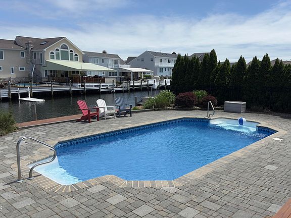 This exceptional, seaside beach house features 77 feet of water frontage on a private cul-de-sac. It includes an oversized garage and a spacious main level floor plan. The home boasts a gourmet kitchen, five bedrooms, two full and one half bath. It features exceptional sunset views and a private backyard, providing a serene outdoor space for relaxation and enjoyment. The private yard includes an outdoor cooking area, a full length deck, a heated in-ground pool, and a dock.