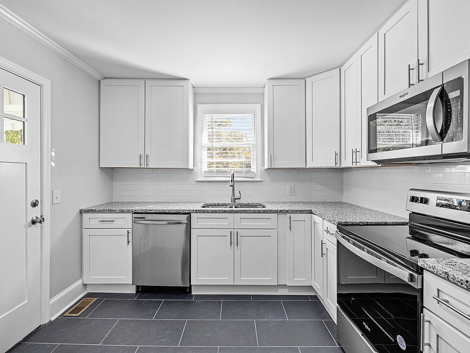 The kitchen has been tastefully updated with shaker cabinets, granite countertops, and a stylish subway tile backsplash, creating a sleek and contemporary atmosphere. Stainless steel appliances add a touch of elegance and functionality to the space.