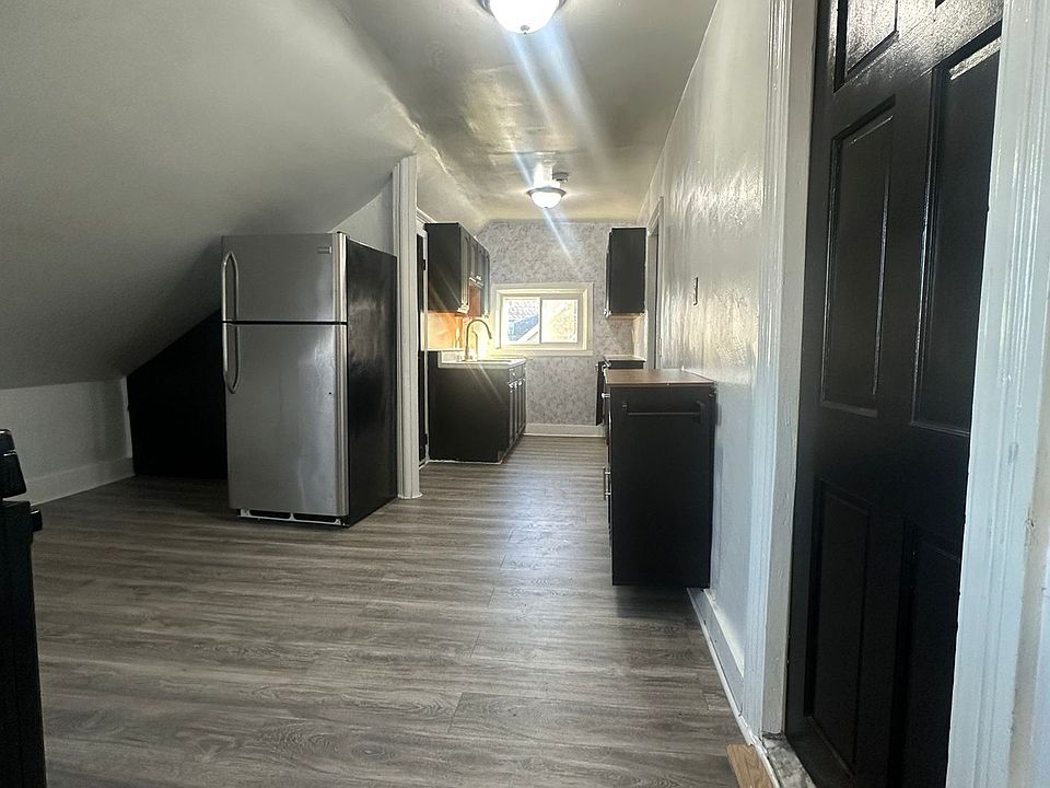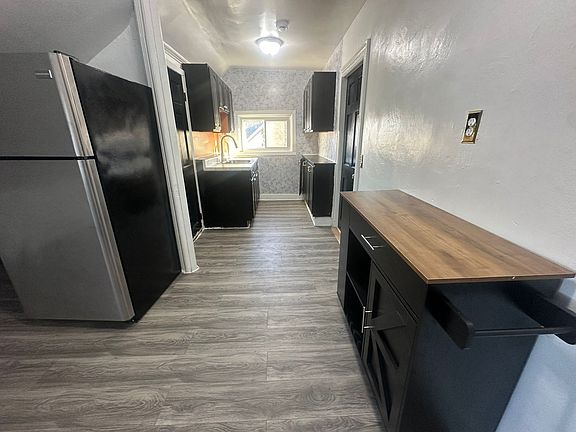 Who doesn't love a big kitchen with matte black cabinets big refrigerator and oven? There is a very long storage space in the kitchen. The amazing luxurious bathtub! New floors!