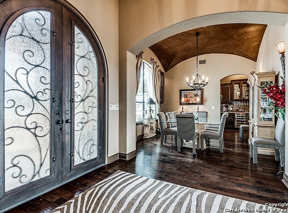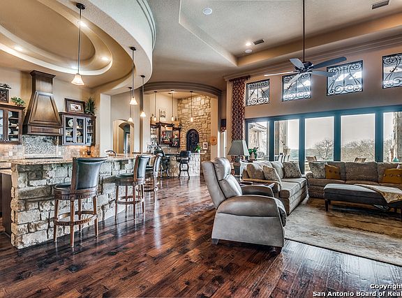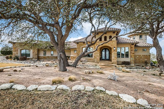 Watch the breathtaking sunset from the backyard oasis of this BEAUTIFUL 1-story Luxury Hill Country home on a 1.68 acre lot in the highly desired neighborhood of Mystic Shore. This custom home features a gourmet kitchen, butler's pantry, wet bar and wine room. Open floor plan, high ceilings and expansive living room opens to the outside patio with oversized folding glass doors. Theater room has 85" screen, wired for surround sound with a fireplace and raised seating, Master retreat has a beautiful view, luxurious turret bathroom with a walk through shower, jetted tub and fireplace. Enjoy evenings on the outdoor deck featuring a luxurious pool, waterfalls, infinity edge, hot tub, fire pit and an outdoor grill & kitchen. Enjoy the amazing views overlooking the nature preserve and Devil's Hollow from the cozy and tranquil covered patio. Oversized 3 car garage plus many more upgrades. Neighborhood amenities include boat ramp, lake front park, playgrounds, jogging & biking trails, sports courts and much more.