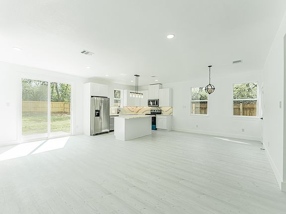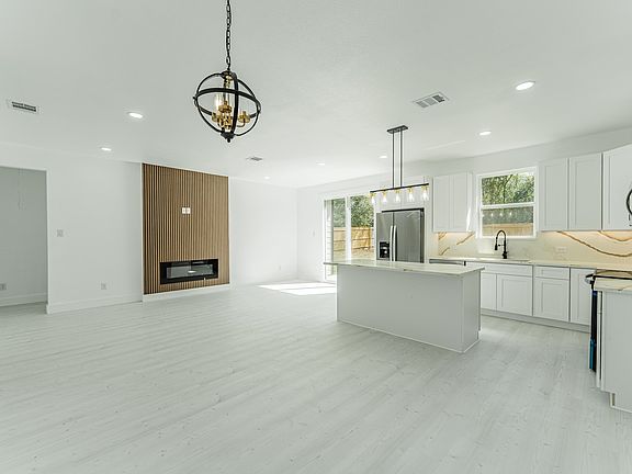 Modern electric fireplaceOpen concept floor planRecessed lightingStainless steel appliancesNatural lightDecorative lightingPrivacy-fenced backyard