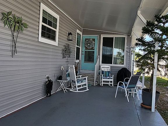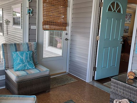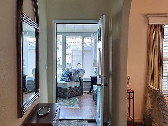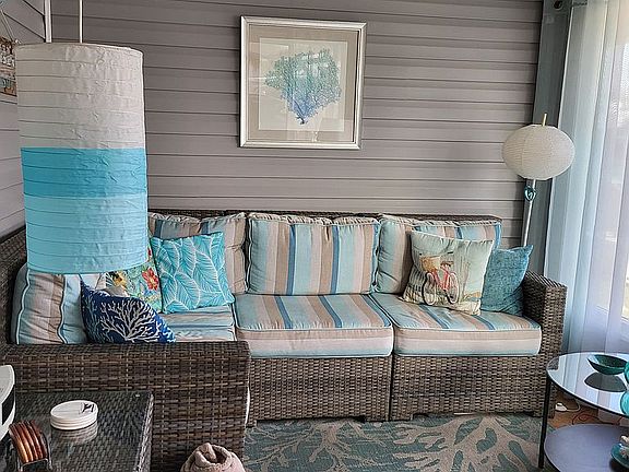 A comfortable lanai/porch is surrounded by large sliding windows and screens.
