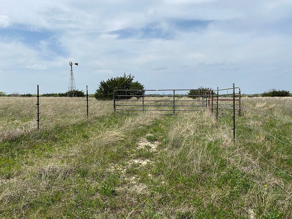 43.455 acres with about a 3 acre lake. The lake is stocked with fish and has a fishing dock. There is also a gravel pit that holds water. The property is fenced all around and has a fenced section for a holding pen or could be a food plot for the deer. There is also an old windmill but it no longer works and a container that has shelving started and has electric stubbed in but is not active and there is a 30 and 50amp RV hook up on the electric pole. (Due to the drought the lake does not look like the picture now)