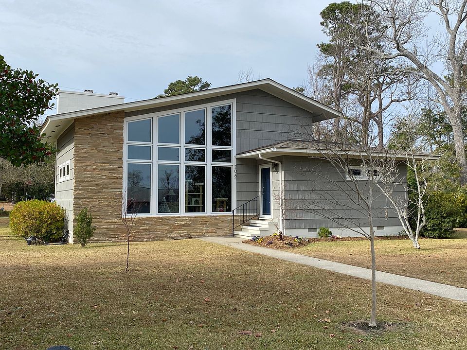 Updated mid-century modern, single-family home in Mitchell Village Neighborhood is just blocks from Bogue Sound & Mitchell Village Park, yet only minutes away from shopping, restaurants, and historic downtown Morehead City. New energy-efficient windows, appliances and countertops; kitchen that is open to dining & family rooms, updated large full bathroom & 2 half-baths, large living room with vaulted ceiling and loft, laundry room has washer, dryer, storage & drop zone, large yard for playing & privacy, and storage shed.