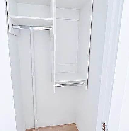 Modern full-tile bathroomSpacious main areaSleek kitchenettePolished hardwood floorsCloset with built-in shelving