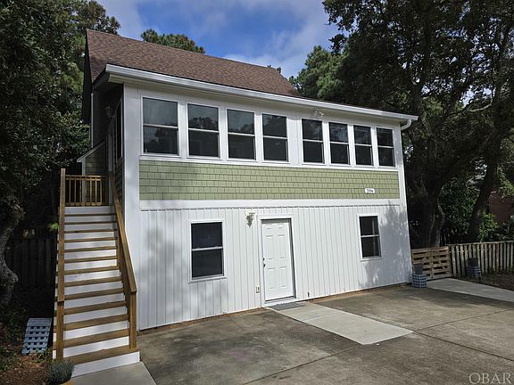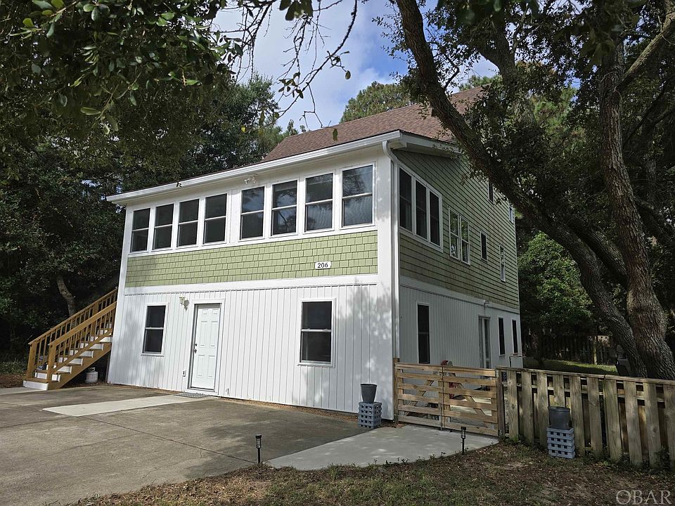 Nestled on the edge of Jockey’s Ridge State Park, this home is adaptable, whether it be your new spacious primary home, or your next investment capable of renting upstairs separately from downstairs, or perhaps a mix of both to help make your mortgage more manageable. Upstairs, wrapped in windows, you’ll feel right amongst the singing birds in the branches of your large live oak tree as you enjoy the morning light. This open concept space, with high vaulted ceilings, links your dining room, kitchen, and living room together, all able to share the light that these many windows provide. Hardwood floors and luxury vinyl plank run throughout most of the home. Built originally in 2001 and remodeled with additions in 2023, much of this home feels new and updated.