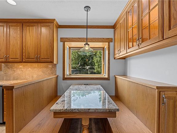 The heart of the home is the stunning kitchen, featuring solid custom cabinetry, granite countertops, stainless steel appliances, a double oven, pull-out shelving, and elegant glass-front cabinets. A built-in dining table and a cozy bay window offers the perfect spot for casual meals with a view of the backyard.
