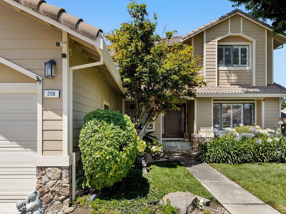 Beautifully updated home in the Stonegate neighborhood, just steps from Stonegate Park and set on an expansive 10,000+ sq ft lot perfect for gathering, gardening, and play. Designed for versatility, this spacious 5-bedroom layout is a rare design and includes two bedrooms and a full bath downstairs, offering flexibility for guests or multi-generational living. Rich wood flooring, plantation shutters, and vaulted ceilings create an inviting flow through the living and family rooms, anchored by a gas fireplace with tile surround. The kitchen blends classic rustic charm with modern function featuring white farmhouse-style cabinetry, soapstone counters, open shelving, tiled backsplash, stainless steel appliances, a Bosch cooktop, and a breakfast bar peninsula overlooking the additional dining area and yard. Upstairs, the primary suite feels like a private retreat with vaulted ceilings, natural light, and an ensuite complete with dual sinks, soaking tub, walk-in shower, and stone counters. Outside, enjoy your own backyard oasis with a solar-heated pool, rock waterfall, turf play area, garden beds, mature landscaping, and covered patio ideal for year-round entertaining. A rare blend of comfort, space, and resort-style living, this home perfectly captures the art of California living.