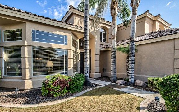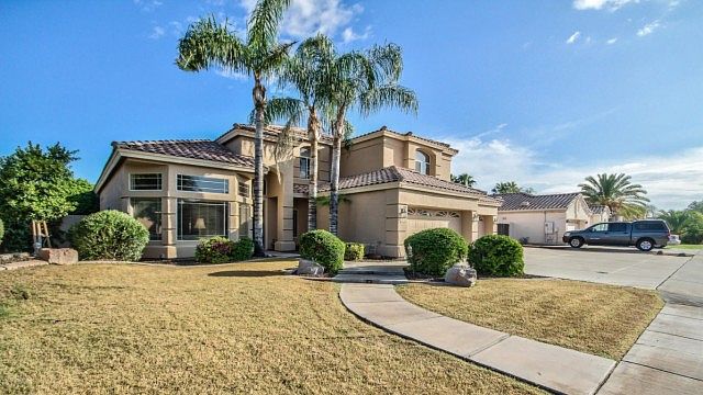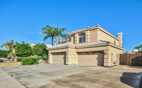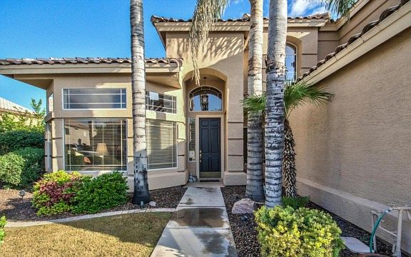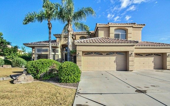 Stunning 5 bedroom 3 bath two story home is sure to impress from start to finish! This fantastic home offers tile/wood in all the right places, soaring vaulted ceilings, arch ways, tasteful paint, formal living/dining area, fireplace, ceiling fans, huge master suite plus a large kitchen with beautiful island and plenty of counter space. Backyard is your own resort themed getaway complete with covered patio, palm trees, lush green grass and a sparkling blue pool complete with waterfall. You won't want to miss this one, Contact us today to view!