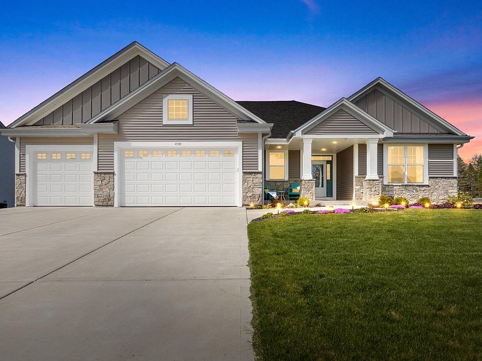 Newer construction ranch home totals more than 2,000 sq ft of beautiful finishes. Walk into the open concept design that greets you w/ a large foyer & beautiful bright light. The great room boasts vaulted ceilings & a cozy FP. The kitchen features a walk-in pantry, Quartz counters & stunning stainless appliances for fabulous entertaining! Spacious primary suite w/ W-I-C, en-suite bath w/double vanity, Granite counters & a large tile shower w/ 2 shower heads! 2 more BRs & full BA complete this package. You'll love the mud/laundry room w/ lockers, right off the 3.5 car GA. The LL features an egress window system, full bath rough & a radon system already installed. New construction feel without the hassle - driveway & landscaping completed!
