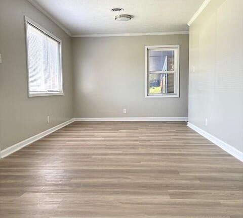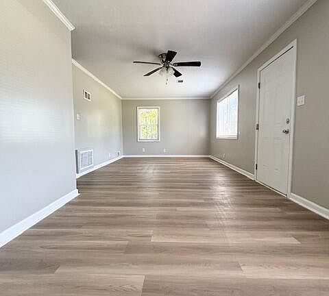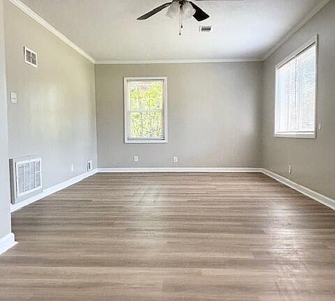 Upon entering this home, you first notice the open living and dining space to your right and left. This 3 bedroom one and a half bath home renovations include 30 years architecture shingles, freshly painted walls, and laminate wood floors throughout. This home also includes new insulated windows, blinds and light fixtures. The galley kitchen is boasting of beautiful blue cabinets and stainless-steel appliances. All bedrooms have ceiling fans. Both bathrooms are updated with white cultured marble top vanities. Exiting the side door is the screened-in sunroom/laundry room which leads to the new wood deck. The fenced-in outdoor space has a 15x8 shed with light and insulated windows. This beautiful home is conveniently located minutes from Bobby Jones Highway 520 when traveling to your getaway destinations.