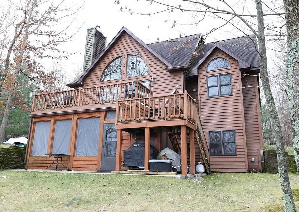 Uplifting 4 bedroom, 3 bath lake home is a fun place for gathering with family and friends! Greatroom is light and bright with brick wood burning fireplace, vaulted wood ceiling, double patio doors to the deck and huge arched window offering beautiful lake views to both the main floor and loft. Open kitchen with granite counters, graphic tile backsplash and breakfast bar was remodeled in 2022 and is open to the dining area. Main floor master has vaulted ceiling, arched window and a desk area with a lake view. Open staircase leads to loft with sitting area, 2 bedrooms and a bath. Lower level has large guest room with bistro table nook, bathroom, large family room and laundry. Great design choices include bathrooms on every level, screened entry porch and screened patio area under the main deck. Property has .85 acres and 150 feet of frontage on this clear water lake, just 10 minutes from Shell Lake.
