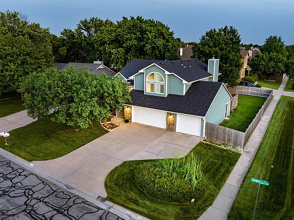 Your dream home has finally hit the market! This property is located on a corner lot in a cul de sac within an established southeast Wichita community. It’s also close to McConnell Air Force Base and easy access to major employers. Let's start with curb appeal. As you drive up, you will notice the lush green lawn, fresh exterior paint, and new roof just over a year ago. Looking for a 3 car garage? This one would qualify as a 3.5+ with the oversized tandem third car space that’s perfect for a car enthusiast or hobbyist. This home is dripping with pride of ownership. Step inside the 4 bedroom, 2.5 bath property and prepare to be wowed! There are soaring vaulted ceilings in the living and formal dining rooms. The eat-in kitchen offers Corian counters and stainless appliances, plus access to the first of three decks and a screened-in porch through the sliding glass doors. A lower level family room has walkout access to a patio and screened porch. This area is also centered around a cozy fireplace that you can curl up next to during the cooler months. Upstairs, there are three bedrooms including the primary bedroom with double doors leading to the spa-like en suite bath with a shower and double vanity. This massive bedroom features the most beautiful windows and custom shutters. Head outside and check out your new outdoor oasis, offering multiple spots for you to enjoy the outdoors year round. It’s fully surrounded by a wood privacy fence, making this the ideal spot for summer get-togethers with family or friends. Located within walking distance of local schools and close to grocery shopping, parks, restaurants, and more, you've found a wonderful home in a convenient location. Schedule your private showing and get in to see this gem TODAY before it's gone forever!