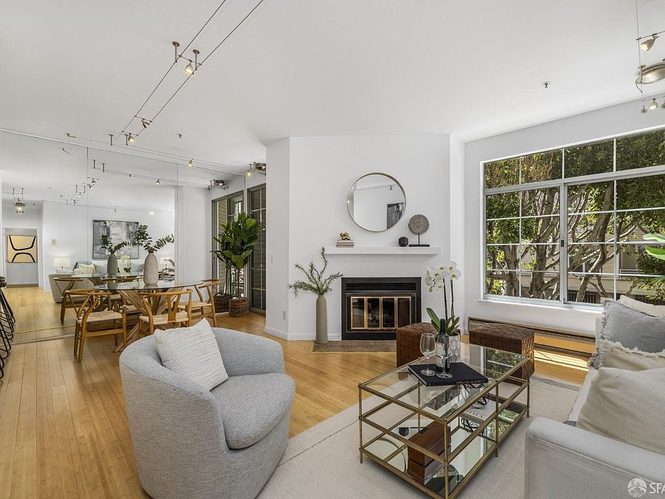 Located in the heart of Lower Pacific Heights, this remodeled 2BR/2BA condo has an open-floor plan concept with the dining room and living room located directly off the kitchen. This layout is seamlessly connected, which is ideal for both hosting guests and comfortable at-home living. The renovated gourmet kitchen includes Caesarstone countertops, Viking stainless steel appliances, Bosch dishwasher, ample cabinetry and breakfast bar. A private balcony with all day sun exposure is located off the dining room and is perfect for your peaceful outdoor enjoyment. Two spacious bedrooms are bright with natural light and both bathrooms have been updated with quality finishes. Other highlights include bamboo hardwood floors, generous closet space, wood burning fireplace and in-unit washer and dryer. This well-maintained pet-friendly building has an inviting common entry, elevator for convenience, independent one car garage parking with EV charger and private storage room. Enjoy the beautiful shared common area garden with barbecue and lawn which is great for unwinding outdoors. Conveniently located near public transit and a block from the highly desirable and vibrant Fillmore Street. Walk Score of 99, a great home for those seeking the perfect blend of comfort, style and convenience.