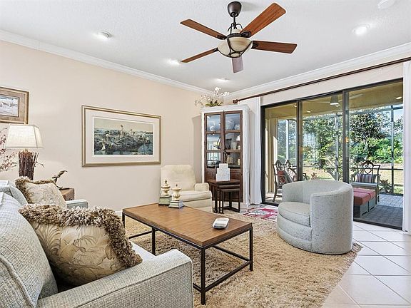 Enjoy resort-style living at Venetian Falls! This desirable 2-bedroom, plus den, Sorrento home is ideally located near the clubhouse and amenities, and offers thoughtful upgrades throughout. The open floor plan features ceramic tile flooring, crown molding, plantation shutters, and granite countertops in the kitchen and baths. The kitchen has solid wood cabinets with under-cabinet lighting, custom backsplash, stainless steel appliances, and a sunny dinette with a built-in bench under a bay of windows. The den includes French doors and a built-in hideaway desk for flexibility. Additional highlights include pavered driveway, walkway, and extended lanai, custom closets, laundry room cabinetry, and ample garage storage. Enjoy peace of mind with hurricane panels and a convenient accordion lanai shutter. Residents benefit from onsite management, maintenance-free lawn care, cable and internet package, and exceptional amenities—heated lap and resistance pools, spa, fitness center, billiards, internet café, arts and crafts room, bocce, putting green, clubhouse with activity director, and more—just minutes from Venice beaches, dining, and shopping! Full furniture package available under separate contract.