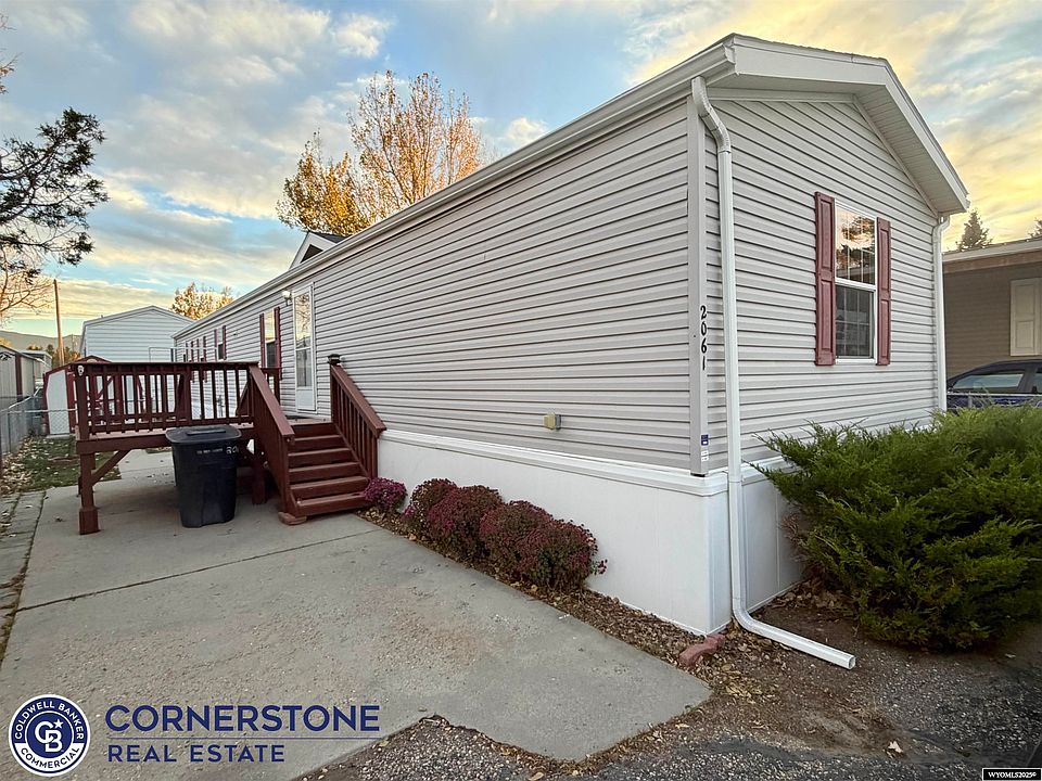 Built in 2007, this well-maintained 3-bedroom, 2-bath home features a popular open floor plan with built-ins and new flooring throughout. Enjoy a spacious deck and a fenced area perfect for pets. The mobile home and shed are located on a rented lot for $675/month, which includes water, sewer, and trash services. Situated in a 55+ community, this property offers comfortable and convenient living. Seller financing options available. Call or text Dorie G. Nelson with CBC Cornerstone Real Estate at 307-267-1190 for your personal tour!
