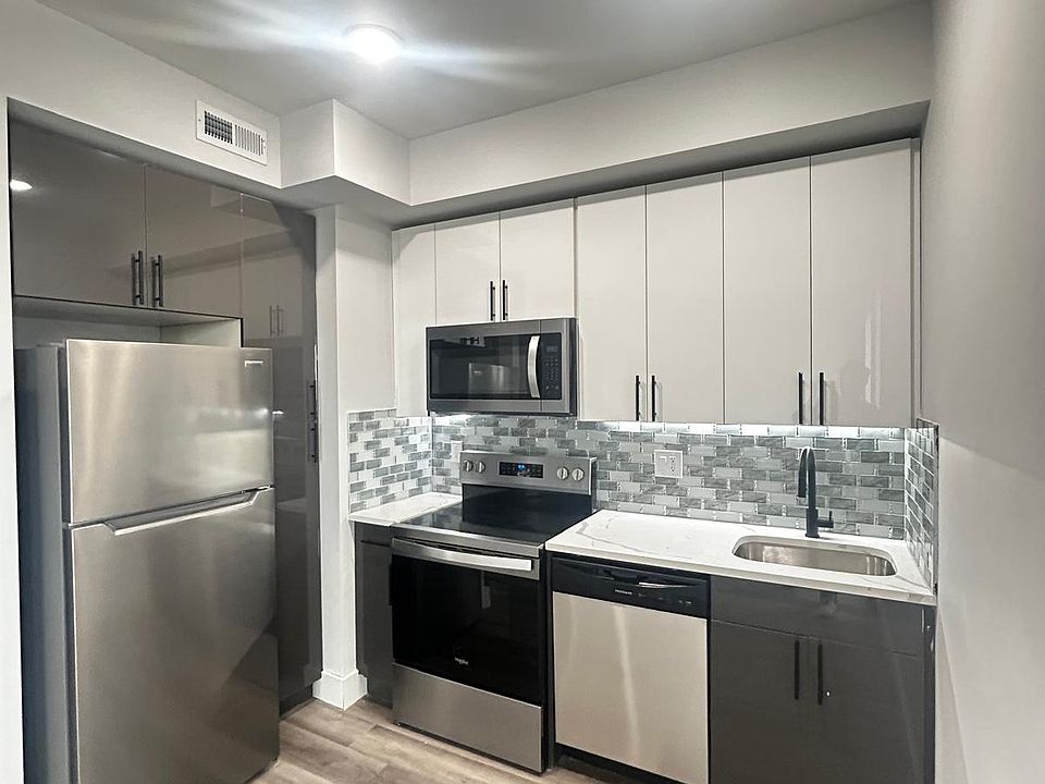 A kitchen equipped with stainless steel appliances (refrigerator, stove/oven, dishwasher, etc.).