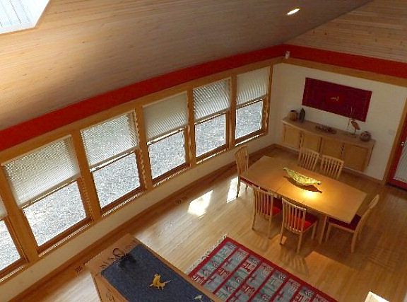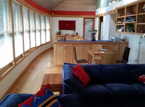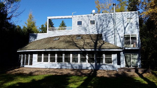 STRIKING, CUSTOM DESIGNED CONTEMPORARY HOME ON SAND BEACH on Ridges Road in Baileys Harbor with a southern exposure for both sunrises and sunsets! Designed to maximize the water views, the wall of windows on the curved shore side of this home accomplishes that goal and more. The long living-dining room has a dramatic, wood, vaulted ceiling; and the room is bathed in natural light. Floors in the living and dining areas are wood, bathroom and kitchen floors are tile, and bedrooms are carpeted. The master bedroom and one and one-half baths are conveniently on the first floor, two bedrooms and a bath are on the second floor, and the third floor room can be put to any use you want. From the third floor is also access to the lookout deck.