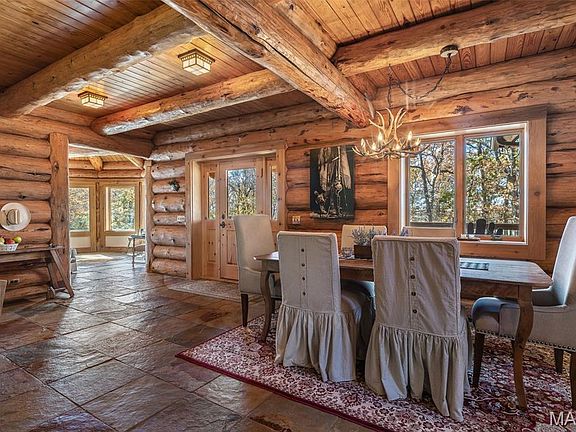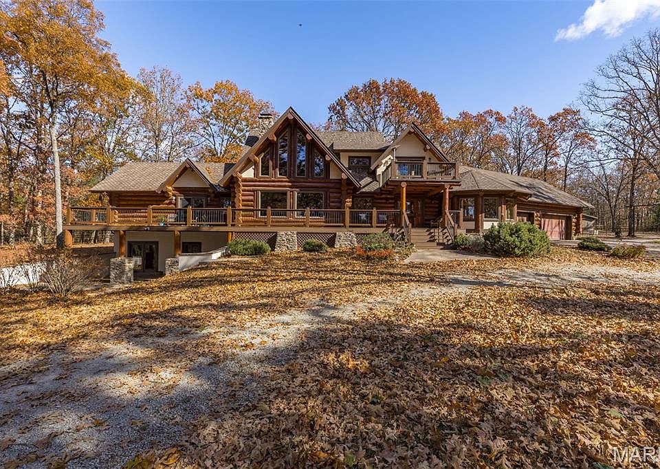 The grand family room will take your breath away with its soaring timber ceilings, massive windows, and incredible craftsmanship, including the 2 story stone fireplace. A lofted recreation area with an en suite bath and living room overlooks the living space below, while the main level features a luxurious master suite complete with a spa-like bath retreat. The finished walkout basement offers even more entertaining space, including a lux bunk room and an authentic saloon — perfect for gathering with friends after a day spent exploring your 30-acre private paradise. Every inch of this home showcases the artistry of Montana log construction — tall timbers, exposed beams, and natural textures that feel straight out of a Taylor Sheridan series. (Seriously, someone call Taylor — he needs to see this place!) Imagine spending your days surrounded by nature—riding along peaceful trails that wind through the woods, then watching your horses graze in the sunlit paddocks below. This property is a dream come true for horse lovers, thoughtfully designed with space to roam and relax. With countless porches tucked beneath the trees, you’ll always have the perfect spot to sit back, sip your drink, and take in the beauty of every season. Outside, you’ll not only find many expansive porches but also, a 3-car attached garage, and a 36x36 barn with stalls and a tack room. This is more than a home — it’s an experience. A rare blend of luxury, privacy, and the rugged beauty Montana is known for- right here in Missouri. This one must be seen to be truly appreciated.
