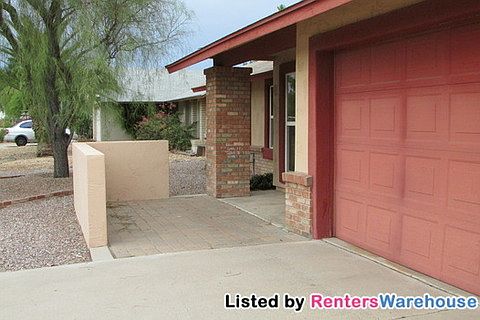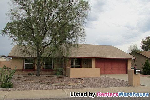 This 3 bedroom 2 bath home offers a large living room with built-in shelving. A separate roomy eat-in kitchen has pine cabinets with lots of storage and counter space. The master bedroom has a large walk-in closet, an ensuite, and tiled walk-in shower. Brand new travertine tile and ceiling fans throughout. The back yard features a big back yard with a diving pool, covered patio, and grassy area. Close to the I-17 and 101 freeways, Deer Valley Park and shopping. Pets welcome. Contact Darline with RentersWarehouse 602-586-9748 to schedule a showing. Pricing $1,200 + Tax + Service Fee.
