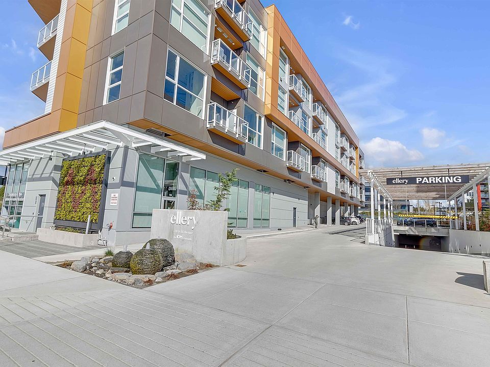 The Ellery. Bright 2-bedroom, 2-bathroom, 3rd-floor unit in Langley's desirable Willoughby neighborhood. Vaulted ceilings and a custom-designed floor plan create a efficient and spacious environment. The kitchen boasts quartz countertops to entertain friends & family, designer tiles & backsplash, a gas range & wide plank flooring. Underground secured parking, storage and bike locker. Enjoy incredible views with communal gardens, picnic benches, lounge chairs, a children's play area and a rooftop patio. It is situated in a central location, offering easy access to all amenities & walking distance to shopping, restaurants, cafes, and more. Heat pump for year-round comfort. Pets and rentals are allowed. Parking #6 P2 and two Lockers #6 & #15.