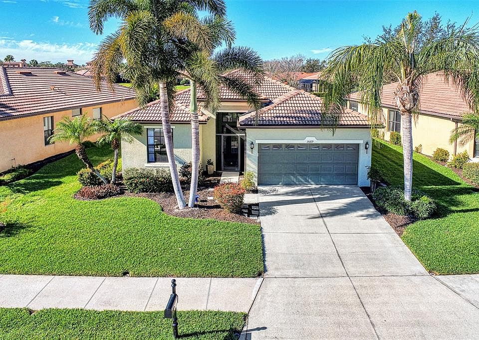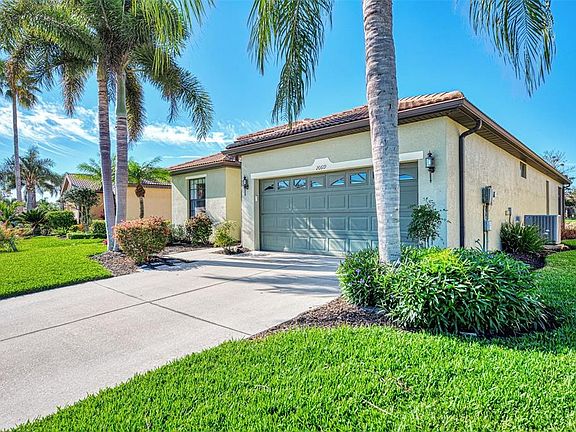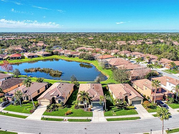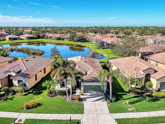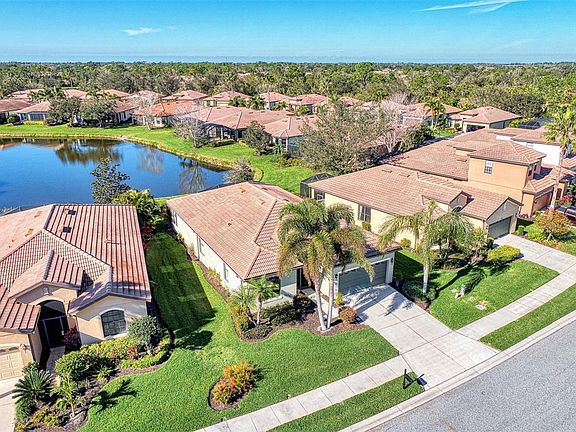 Discover lakeside living at its finest in this stunning Florence model home, nestled in the sought-after 55+ gated community of Venetian Falls! This impeccably maintained 2-bedroom, 2-bathroom residence, with a versatile office/den, offers 1,916 sq. ft. of bright, open living space designed for comfort and elegance. Built in 2006, this home boasts modern upgrades and timeless charm, perfect for those seeking a vibrant yet serene lifestyle. Step inside to a light-filled interior with no carpets—just beautiful tile flooring throughout the main areas. The dream kitchen is a chef’s delight, featuring a quartz waterfall-edge island, high-end appliances, and custom cabinetry, ideal for entertaining or everyday meals. The open-concept living area flows seamlessly to an extended lanai with automatic awnings, offering breathtaking lake views and the perfect spot for morning coffee or evening sunsets. The primary suite is a true retreat, complete with custom closets and an upgraded spa-inspired bathroom. Additional highlights include built-in shelving in the office, custom window treatments, plantation shutters, and stylish custom fans and lighting throughout. Sliders at the back of the home enhance the indoor-outdoor connection, inviting you to enjoy the tranquil waterfront setting. This home also features a two-car garage, low HOA fees (with no CDD fees), and includes landscaping, basic cable, and high-speed internet for effortless living. The vibrant Venetian Falls community, with 700 homes, offers a nearby clubhouse, on-site management, and a host of amenities to enjoy an active and social lifestyle. Don’t miss your chance to own this move-in-ready masterpiece in a premier 55+ community, where lakefront luxury meets modern convenience. Schedule your private tour today and make this dream home yours!