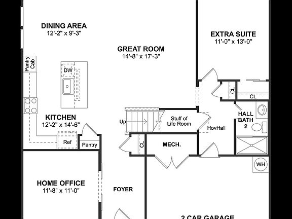 Modern farmhouse style kitchenSpacious great roomFirst-floor extra suiteDining areaThree additional bedroomsLaundry room