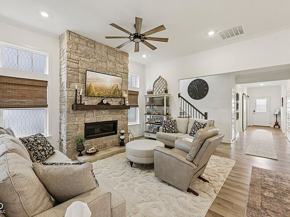 Spectacular Stylish Home with Wonderful Floorplan! Primary Suite is on the Main Floor with 2 additional Bedrooms upstairs + a versatile Loft/Lounge. Striking Custom Stone Fireplace is floor to ceiling and includes a limestone hearth. Bright Chef's Kitchen with white cabinets has a large island, stainless steel appliances and a gas oven/range. Designer-look lighting and modern ceiling fans create inviting spaces. 1st Floor Study or work from home space provides lots of options. Covered back patio has been enclosed for privacy and is a great spot to watch Fall Football. 3 car garage is distinctive with industrial pendant lighting, extra outlets, including a 220 outlet for a fridge or freezer. The covered porch is wide enough for seating--your choice! Room for chairs or a porch swing. Easy to show---come take a look. Neighborhood amenities include pickleball, basketball and tennis courts, playground, walking trails, community pool and clubhouse. ***Seller is offering Special Financing to lower Buyer's Interest Rate.