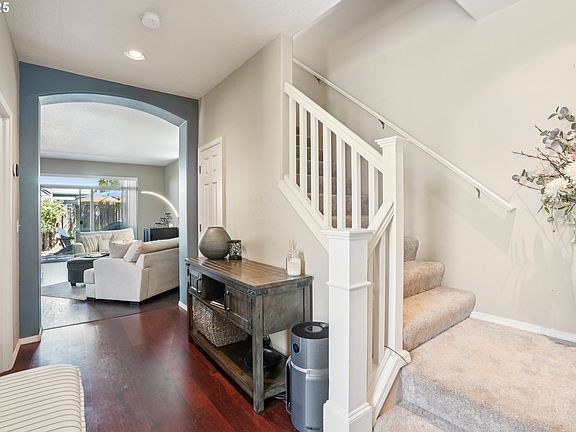 Welcome to this beautifully maintained, move-in ready home in the highly sought-after Arbor Vineyards community. Set along peaceful, tree-lined streets, this two-story gem features 3 bedrooms, 2.5 bathrooms, and an inviting layout designed for comfort and functionality. Step inside to find gleaming hardwood floors and a bright, open-concept main level, where the spacious living room centers around a cozy gas fireplace. The updated kitchen has quartz countertops, tile backsplash, upgraded cabinetry, a pantry, and generous counter space. A convenient half bath completes the main level.Upstairs, the primary suite offers a relaxing retreat with an elegant tray ceiling, a large walk-in closet, and an ensuite featuring dual vanities and a walk-in shower. Two additional bedrooms, a shared full bathroom with tub and shower, and a centrally located laundry area add practicality and comfort. At the top of the stairs, a versatile bonus space is perfect for a home office, reading nook, or play area.This home is equipped with central air conditioning for year-round comfort and includes recent upgrades such as a new furnace.Enjoy low-maintenance living with front yard landscaping and irrigation covered by the HOA. The community features walking paths, a playground, and a nearby park. Ideally located just minutes from the Intel Aloha Campus, Nike, The Reserve Vineyard & Golf Club, Jenkins Estate, Reeds Crossing, and top-rated schools, with easy access to shopping, dining, and entertainment.