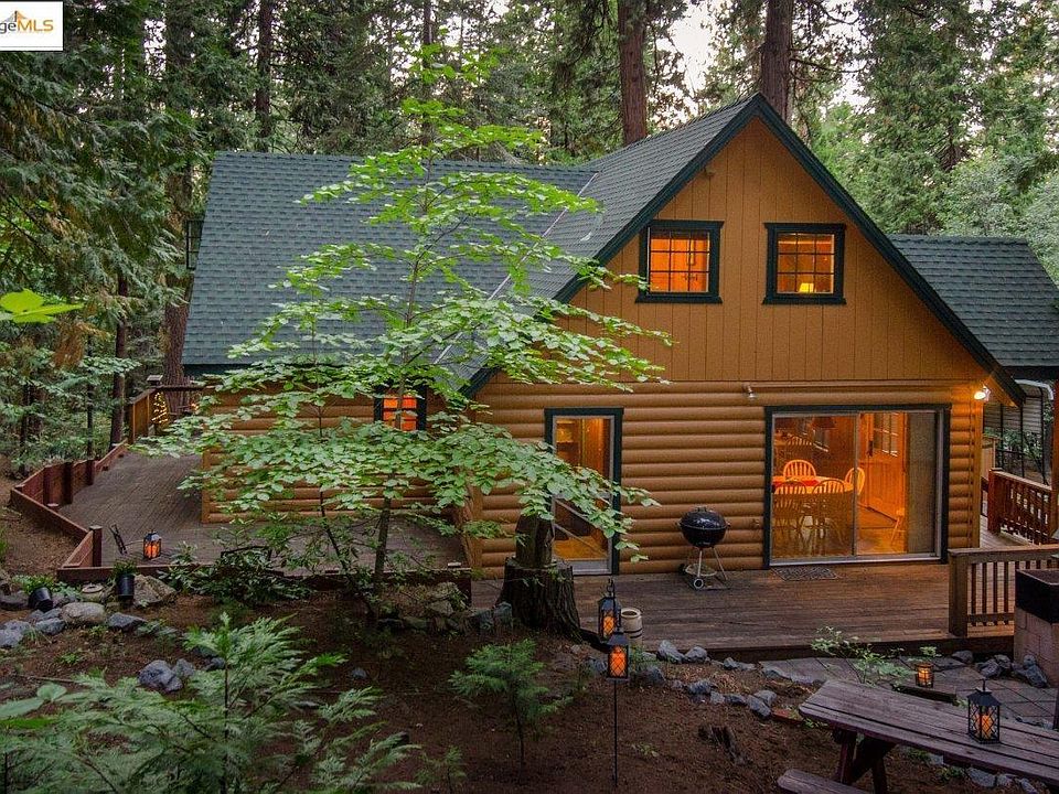 BRAND NEW TO MARKET AND LOADED WITH MOUNTAIN CHARM! Traditional log cabin nestled in the woods. Authentic charm with knotty pine interior and rustic mountain decor touches throughout. Primary bed / bath on main floor with walk in closet. Upstairs hosts multiple beds with 3 private bedrooms and an open loft. Sleeps 10-12. Wrap around deck is perfect for BBQ & entertaining. Detached garage. RV carport. Corner lot. Large laudry room / pantry off kitchen with shelving for ample storage. Premium, mostly level 1/4 acre lot. Excellent proximity to Highway 108, restaurant, gas station and local market. Enjoy leisurely walks in the charming community known as The Village, where life moves at a slower pace and neighbors form genuine connections. This home is a sweet and special retreat taking you back to yesteryear. ***Recent updates include new laminate flooring on the main level and a stunning river rock facade on the exterior fireplace chimney not reflected in the photos.