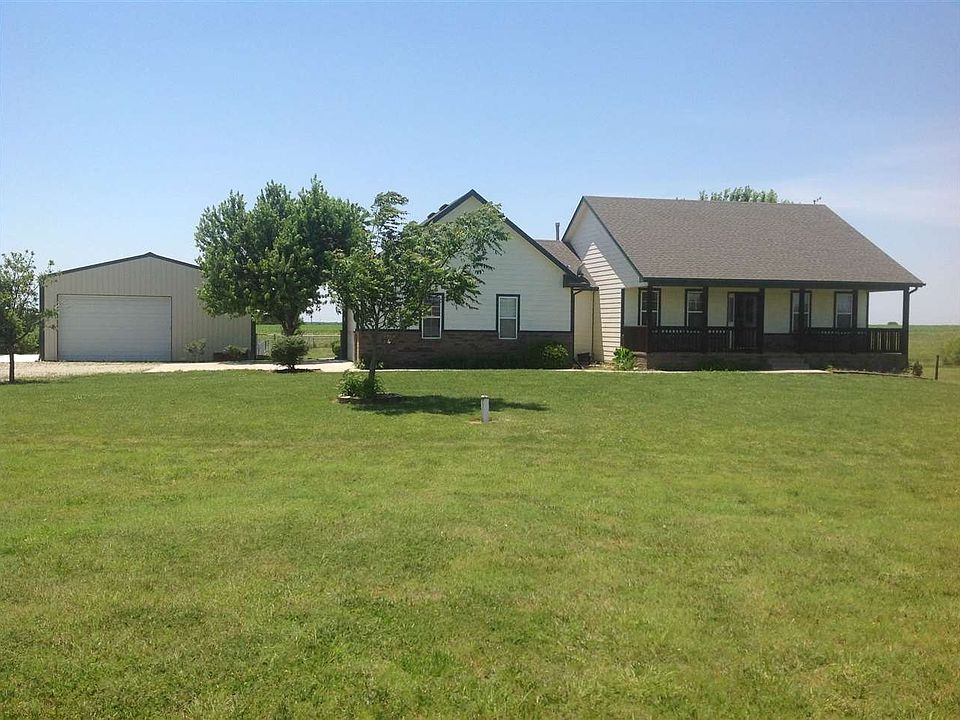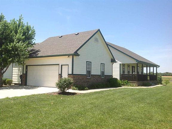 Beautiful Country Home located on a peaceful 4.1 Acre lot. Home is so attractive from the front and all the way thru to the covered back porch with stunning view of Kansas Sunsets. Step into the large foyer that opens to a formal dining and main living area. Beautiful hardwood floors, vaulted ceilings, an open floor plan with two-sided gas fireplace between living and kitchen. The kitchen is well equipped with ample counter space including a serving/eating bar, beautiful cabinets and appliances, and lots of storage. Split-bedroom plan features Master bedroom with large with large soaker tub and separate shower, walk-in closet, and separated from bedrooms at other end of home. Basement is view-out with large family room, 4th bedroom, full bath, and good amount of unfinished storage. You will love the 4 acres with some fencing, small pond, and especially the 30x40 detached garage with additional concrete slab for future expansion if desired or RV parking. The is is a great country property close to Rose Hill but within 15 minutes of Derby and Rock Road corridor. Home is immaculate--You'll love it!