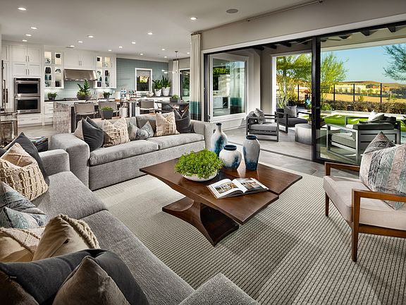 Luxurious design and style. The Moreno's welcoming covered entry and foyer reveal the stunning curved staircase, spacious formal dining room and great room, and desirable outdoor living space beyond. The well-designed kitchen is equipped with a large center island with wraparound breakfast bar, ample counter and cabinet space, sizable walk-in pantry, bright breakfast nook, and butler pantry dining room access. The majestic primary bedroom suite is enhanced by an elegant coffered ceiling, relaxing retreat, palatial walk-in closet, and deluxe primary bath with dual vanities, large soaking tub, luxe glass-enclosed shower with seat, and private water closet. Central to a generous loft, the spacious secondary bedrooms feature roomy closets and private full baths. Additional highlights include a desirable first floor guest bedroom with walk-in closet and private full bath; convenient powder room and drop zone off the foyer; and centrally located second floor laundry.