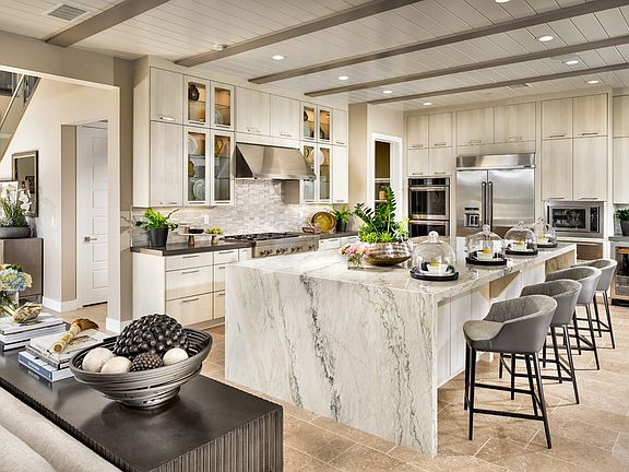 Luxurious appointments. The Langham's welcoming covered entry and foyer with elegant turned stairs overlook the lovely interior courtyard, and reveal the spacious great room, dining room, and desirable luxury outdoor space beyond. The well-designed kitchen is equipped with a large center island with wraparound breakfast bar, ample counter and cabinet space, and generous dual pantries. The beautiful primary bedroom suite is highlighted by a coffered ceiling, huge walk-in closet, and deluxe primary bath with dual vanities, large soaking tub, luxe glass-enclosed shower with seat, and private water closet. Secondary bedrooms feature sizable closets, two with private full bath, one with shared full hall bath. Additional highlights include a generous loft, guest bedroom with roomy closet and private full bath, convenient powder room and drop zone, and centrally located laundry.