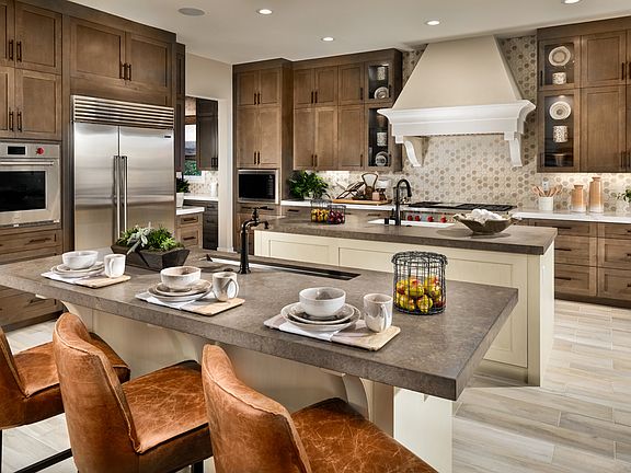 Luxurious appointments and style. The Stanwick's impressive stepped entry and rotunda-style foyer reveal a beautiful curved staircase, and views of the expansive dining room, great room, and desirable luxury outdoor living space beyond. The well-appointed kitchen is equipped with a huge center island with wraparound breakfast bar, ample counter and cabinet space, generous walk-in pantry, and bright nook. The gracious primary bedroom suite is complete with elegant coffered ceiling, dual walk-in closets, and deluxe primary bath with dual vanities, large soaking tub, luxe glass-enclosed shower with dual drying areas, and private water closet. Secondary bedrooms each feature roomy closets and private full baths, and are central to a sizable loft. Additional highlights include a versatile first floor bedroom with closet and private full bath, convenient powder room and drop zone, and centrally located laundry.