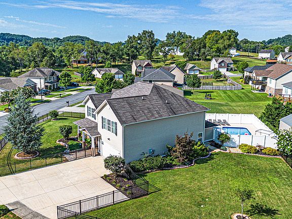 This stunning two-story traditional home offers 2 primary suites (one on main) and a perfect blend of modern luxury and timeless design. This 3,418-square-foot residence features 4 spacious bedrooms each with their own walk-in closet, and 3 1/2 bathrooms. The gourmet kitchen is a chef's dream, complete with top-of-the-line appliances, granite countertops, and a farmhouse sink. The main level hosts a luxurious primary suite with a jetted tub and an enormous walk-in closet. The great room, with its gas log fireplace, opens to a beautifully designed outdoor living area featuring a heated in-ground pool and a cozy outdoor gas fireplace, making it perfect for entertaining. Upstairs, a second primary bedroom with full bath, two additional large bedrooms, family room and a versatile bonus space provide ample space for family and guests. The home is set on a landscaped corner lot in the desirable Autumn Woods Subdivision, offering privacy and charm. Crown molding, new flooring, and updated lighting fixtures throughout add elegance to the home. The 2-car attached garage includes lots of storage shelving, providing plenty of room for organization. With its spacious layout, premium features, and prime location, this property is the epitome of comfortable and stylish living in Kingsport. Don't miss the chance to own this meticulously maintained home located in the desirable Autumn Woods Subdivision!