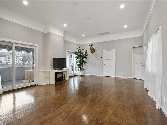 Decorative fireplaceLarge balconyPrivate gated courtyardPanoramic hollywood hillside viewsTerracotta tile flooringCarpet in bedroomsHardwood floors