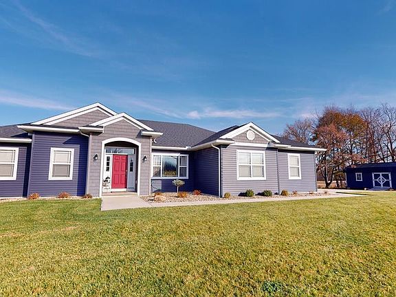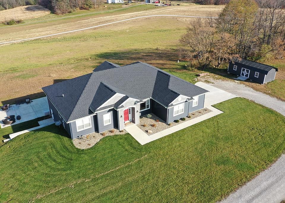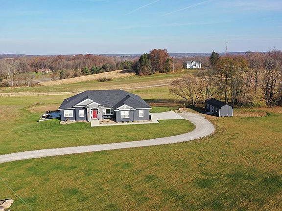 Oh the views! Beautiful country ranch built in 2020 with 3 BR's, 2.5 BA's, and 2,556 sq ft on 7 ACRES! Wonderful open floor plan. Large kitchen w/island, walk-in pantry, under cabinet lighting, top of the line LG stainless appliances, including built-in double ovens. Formal foyer & living area w/columns. Owner's suite w/walk-in tiled shower, his/hers sinks, walk-in closet, & pocket office. Main floor & lower level laundry. Partially finished walkout basement plumbed for 3rd bath & pet washing center, potential 4th BR, & recreational room. Upgrades and storage galore! Covered concrete porch and patio, both with electric. Yard Barn. Only minutes to I-71, US 30, US 42, and St Rt 13.