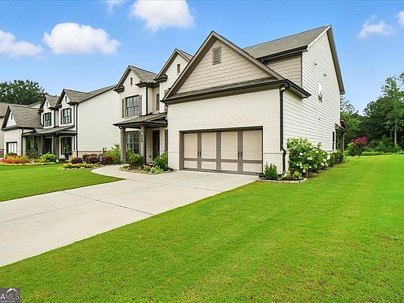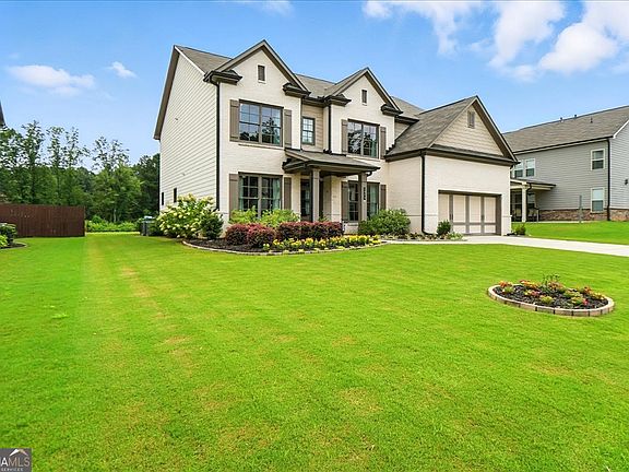 Step into this stunning 3,859 sq ft home featuring an open floor plan designed for everyday living and entertaining. An inviting foyer leads to a formal dining room as well as a flex room-perfect for a home office or formal living room. The great room is a true focal point, complete with a coffered ceiling, cozy fireplace with brick surround, and built-in cabinets. The spacious kitchen overlooks the family room and showcases an oversized island, tall white cabinetry, upgraded lighting fixtures, and plenty of storage. A bedroom with full bathroom on the main floor offers comfort and convenience for guests or multigenerational living. The mud bench with cubbies is conveniently tucked away near the garage entry. Step outside to the covered patio overlooking a deep, level backyard. A secondary family room is perfectly situated among the three additional secondary bedrooms upstairs, including one with its own private en suite bathroom. The primary suite is a true retreat, featuring a double tray ceiling with recessed lighting. The luxurious primary bath includes a tiled shower, tub with tile surround, and direct access to a generous walk-in closet. Located within 1 mile of Twin Rivers Middle School and close to Mt. View High School, this home also offers easy access to GA-316 and I-85, as well as the Mall of Georgia and an abundance of shopping and dining options.
