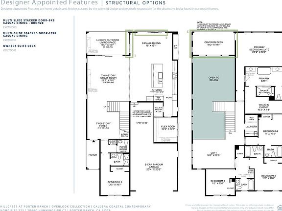 The Caldera welcomes you home with a spectacular covered entry and two-story foyer that immediately flows into the beautiful two-story great room and luxury outdoor living space beyond. The great room, well-appointed kitchen, and roomy casual dining area overlooks the outdoor space, perfect for year-round entertaining. The kitchen is complete with a large center island with breakfast bar, plenty of counter and cabinet space, and sizable walk-in pantry. Just off the kitchen is a private, secluded flex space. Upstairs, the magnificent primary bedroom suite features a spacious walk-in closet and alluring primary bath with dual vanities, large soaking tub, luxe shower with seat, and private water closet. Central to a generous loft, the secondary bedrooms feature ample closets, two with private baths, one with shared hall bath. This home also includes a versatile first-floor bedroom with closet and private bath off the foyer, convenient powder room, and centrally located laundry. Disclaimer: Photos are images only and should not be relied upon to confirm applicable features.