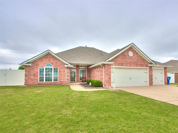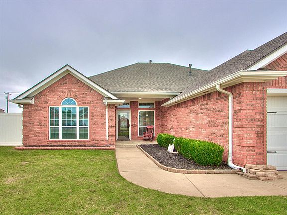 This home exudes comfort doubled with a touch of elegance, white trim crown molding & floorboards flowing throughout the split floorplan complimented with a soft paint pallet, large bedrooms, permanent outside trim lighting & large windows allow for lots of light. A large lot features double white vinyl gates on the West side & a single gate on the East of the front exterior & new wood fence along the West side. A new roof & hot water tank; 9/24 and a 10x15 shop in the back with slab flooring, pull-out drawers in the bottom kitchen cabinets are amplified with upper & lower kitchen lighting, convenient pantry space, close proximity to schools, the Kickapoo turnpike & I-40. An underground storm shelter & wall workbench are convenient in the garage. The neighborhood is quiet with new homes being built & nice neighbors giving security for the neighborhood. The home is listed below the average allowing a buyer to give final touches!
