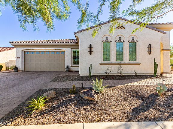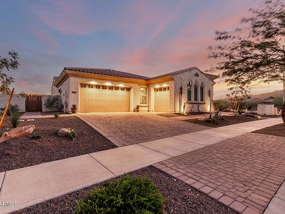 Your dream corner-lot home in Verrado is finally within reach! This stunning residence welcomes you with a 3-car garage, stylish pavers, and a beautifully landscaped front yard. Inside, the open great room impresses with high ceilings, recessed lighting, and elegant tile flooring. The gourmet kitchen features granite counters, rich wood cabinetry with crown molding, chic pendant lights, a tile backsplash, stainless steel appliances, a walk-in pantry, and an island with a breakfast bar. The luxurious primary suite offers soft carpeting, plantation shutters, backyard access, dual vanities, and a spacious walk-in closet. Outside, relax on travertine patios with a heated pool & spa, waterfall, pergola-covered BBQ area, raised garden beds, and a gas fireplace—all with stunning mountain view