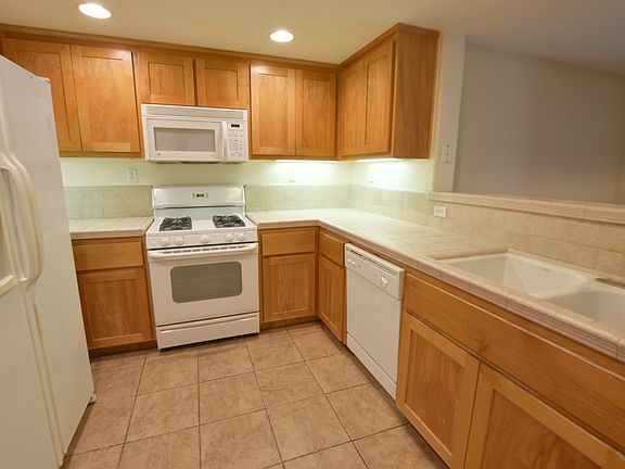 A "Must See" beautiful 3 bedroom + 2 bath tri-level townhouse-style home in a beautiful Mediterranean-styled community with private entrance and private garage. Kitchen features tile counters, alderwood cabinets, side-by-side refrigerator, gas range, dishwasher, and microwave. Other features include recessed lighting, high ceilings, stacked washer/dryer in laundry closet, central AC/heat, private two car tandem garage w/storage shelving, brand new neutral-colored carpeting, tile floors in kitchen and baths, dual pane windows, balcony off living room (BBQ okay). Gorgeous, relaxing heated community pool/spa too.