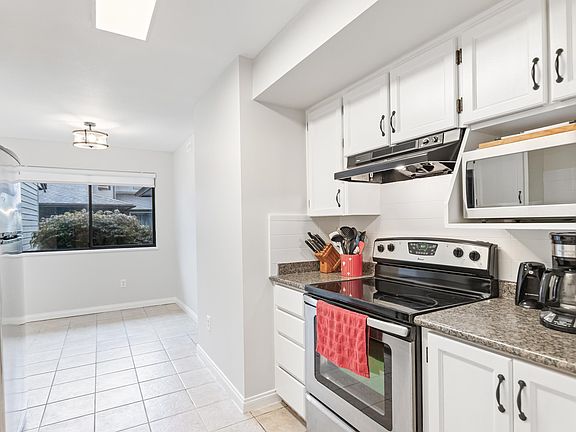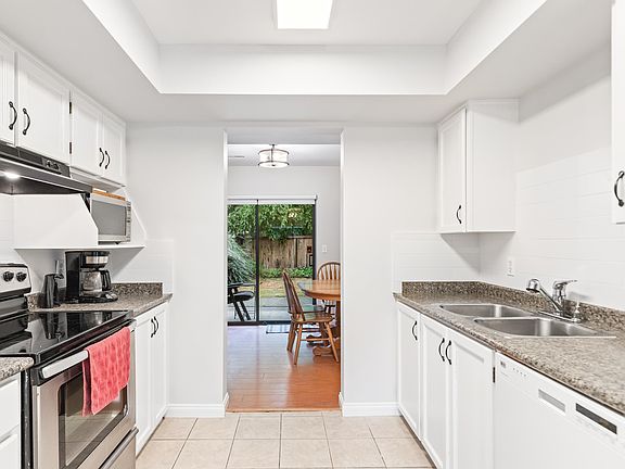 Cozy gas fireplaceUpdated kitchenWhite cabinetryStainless steel appliancesFully fenced backyardLush greenery