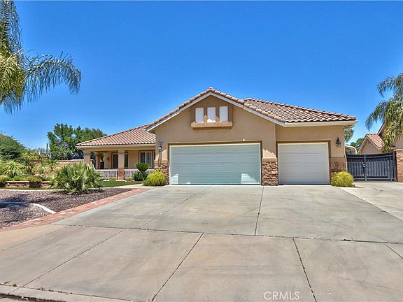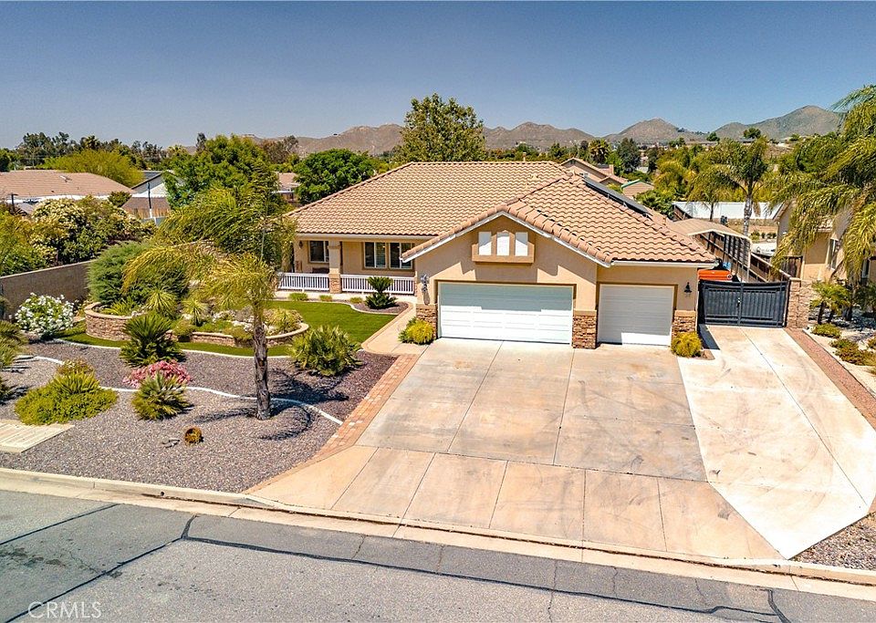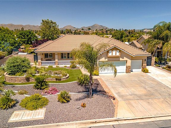 This stunning single-story home, set on a generously sized lot perfect for a pool, features Fully Paid for SOLAR fully panels and is situated in a highly sought-after, tranquil neighborhood in Wildomar. The residence offers 3 Bedrooms and an office which can be used as an additional bedroom creating a 4th bedroom. This home boasts ample RV parking and a vast covered patio in the backyard, ideal for outdoor entertaining. The home is adorned with numerous upgrades, including elegant granite countertops in the kitchen, refined crown molding, and 10-foot ceilings, LVP Flooring and porcelain tile. Plantation shutters grace every window, adding a touch of sophistication throughout. The formal living and dining rooms provide ample space for gatherings, while the expansive open-concept family room flows seamlessly into the large kitchen, equipped with built-in appliances. Plenty of kitchen cabinet space, an island and a walk in pantry. Ceiling fans are installed in most rooms for added comfort. The kitchen and bathrooms are enhanced with durable porcelain tile flooring. The spacious primary master offers private access to the backyard, creating a serene retreat walk in shower, soaking tub, dual sinks and large walk in closet. Additional conveniences include an indoor laundry room and a three-car garage. The front yard is adorned with a charming water feature, providing the soothing sounds of a gentle waterfall. The backyard is beautifully landscaped with room for a room, or casita. This property has no HOA fees and benefits from exceptionally low taxes, making it an outstanding value for its size and amenities. Close to the freeway and shopping.